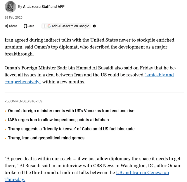 3 hours before Israel and the USA bombed Iran, Al-Jazeera reported that a top diplomatic brokering negotiations between USA and Iran said that Iran had agreed to stop stockpiling enriched uranium and that “a peace deal is within our reach.”