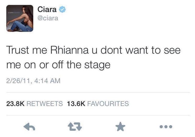 Ha! I remember this was personally devastating to me bc Rihanna had opened for Ciara’s tour a few years prior to this and I loved them both!