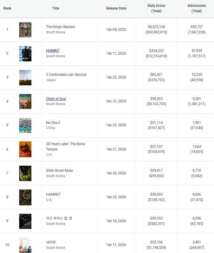 The Man Who Lives With the King: The movie will cross 8 million admits as the movie is locking in ten million admits after such a strong weekend. Maybe a finish of 11 million admits or higher is seriously on the table?