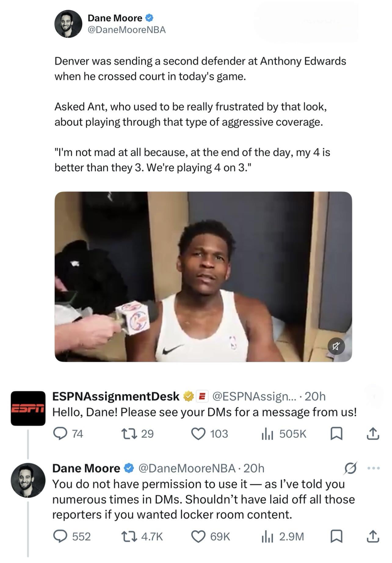 Journalist tells ESPN off after ESPN requests to use his media: “You do not have permission to use it — as l’ve told you numerous times in DMs. Shouldn’t have laid off all those reporters if you wanted locker room content.”