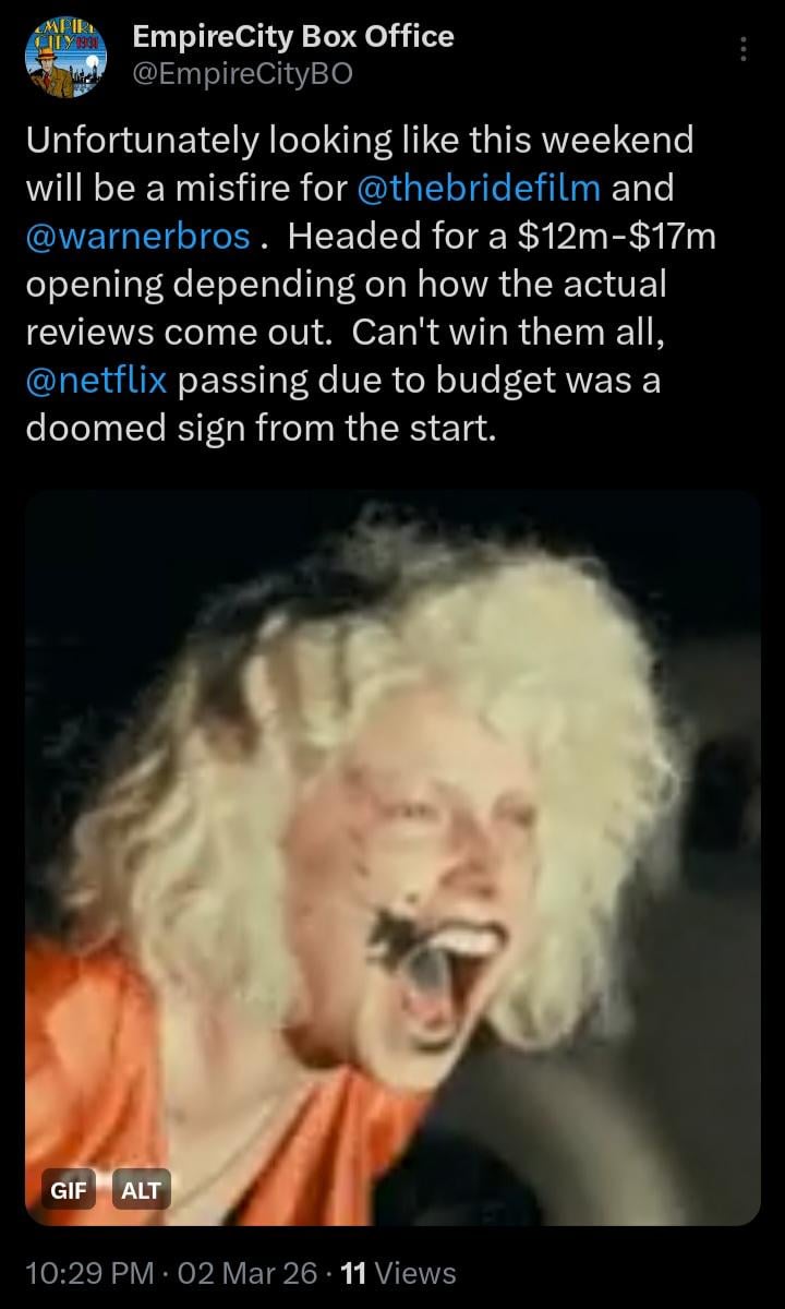 Unfortunately looking like this weekend will be a misfire for @thebridefilm and @warnerbros . Headed for a $12m-$17m opening depending on how the actual reviews come out. Can’t win them all, @netflix passing due to budget was a doomed sign from the start.