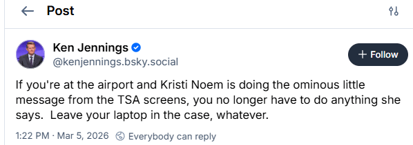 “If you’re at the airport and Kristi Noem is doing the ominous little message from the TSA screens, you no longer have to do anything she says” — Ken Jennings