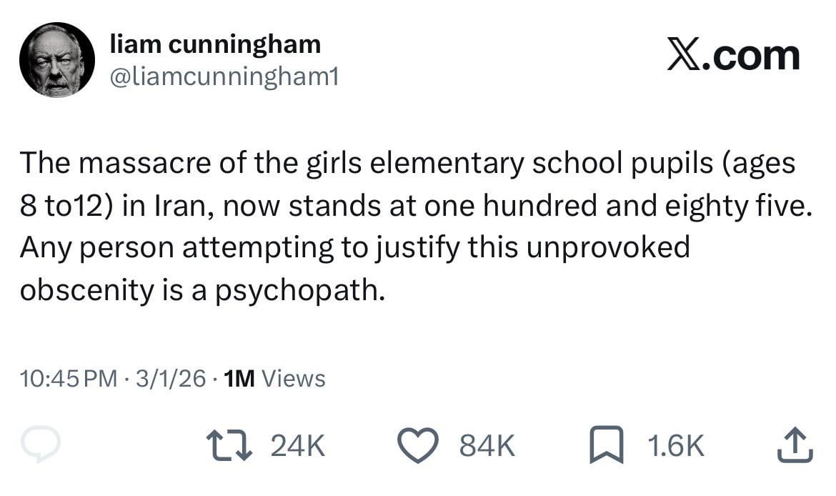 Liam Cunningham speaks on the US-Israeli bombing of Shajarah Tayyebeh School: “The massacre of the girls elementary school pupils (ages 8 to12) in Iran, now stands at one hundred and eighty five. Any person attempting to justify this unprovoked obscenity is a psychopath.”