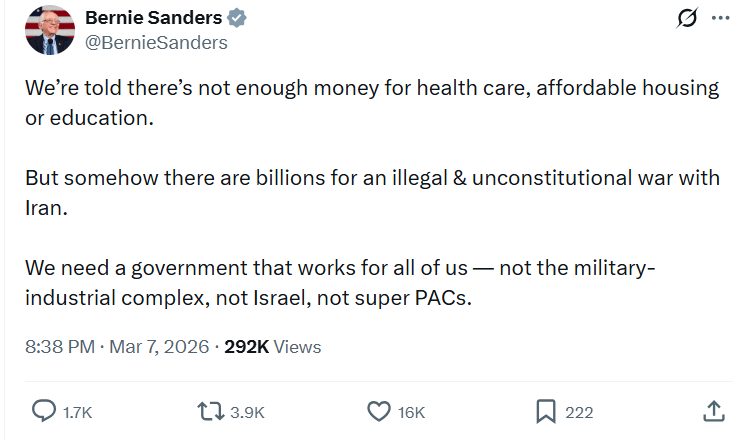 Bernie Sanders: We’re told there’s not enough money for health care, affordable housing or education. But somehow there are billions for an illegal & unconstitutional war with Iran.