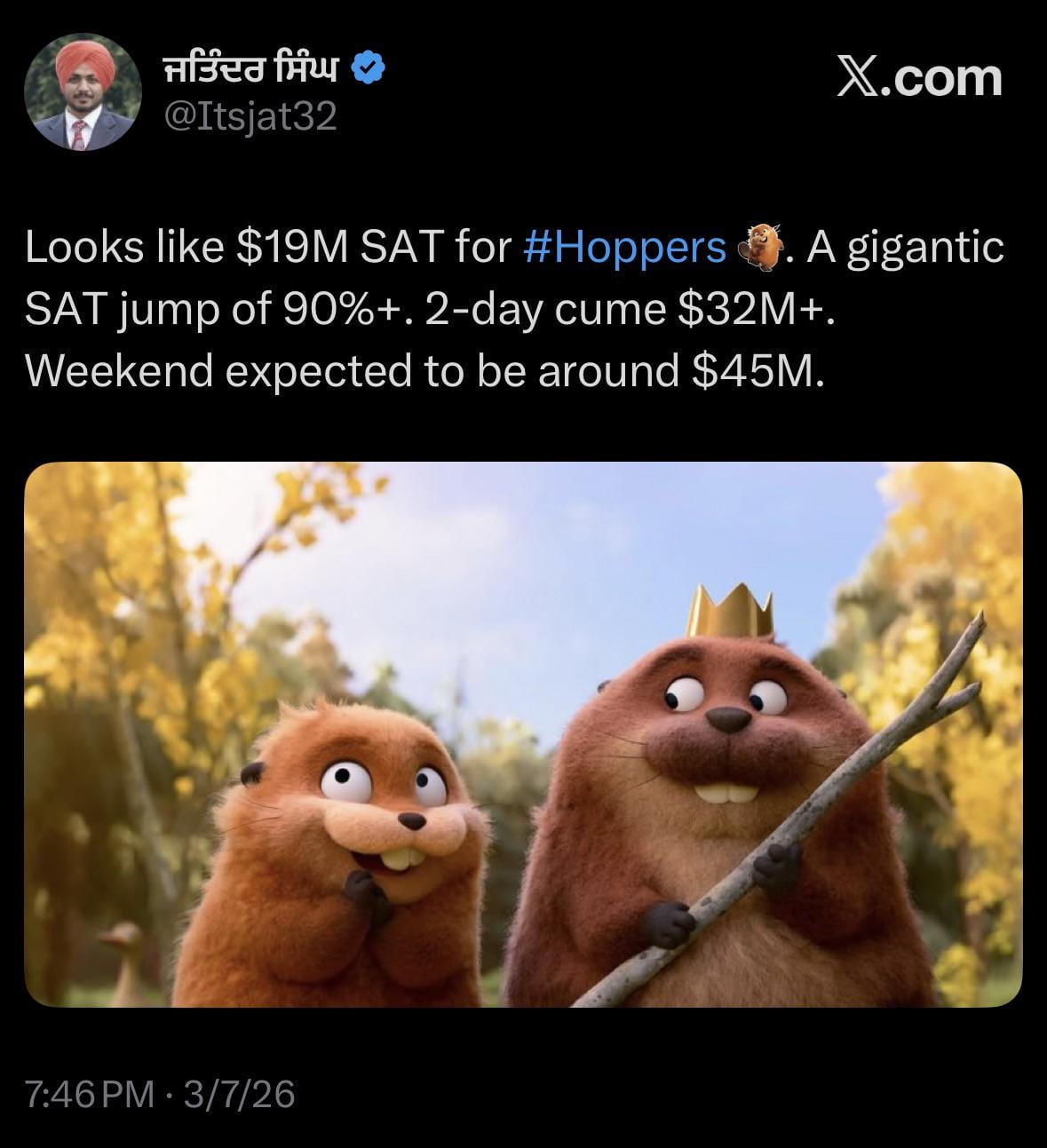 Looks like $19M SAT for #Hoppers . A gigantic SAT jump of 90%+. 2-day cume $32M+. Weekend expected to be around $45M.