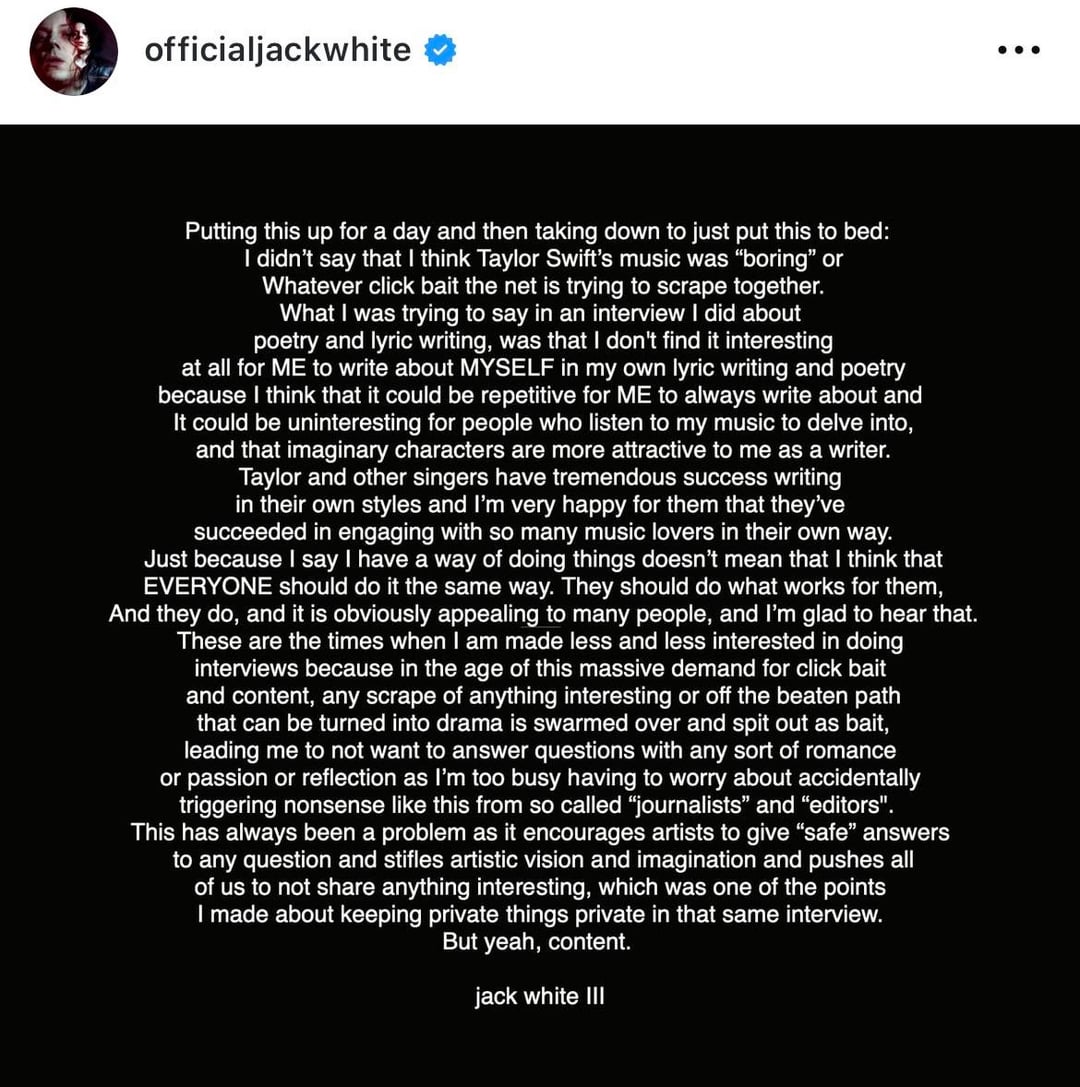 Jack White speaks out following backlash from Swifties after clickbait articles made it look like he called Taylor Swift’s songwriting ‘boring’: “It encourages artists to give “safe” answers to any question & stifles artistic vision & imagination & pushes all of us to not share anything interesting”
