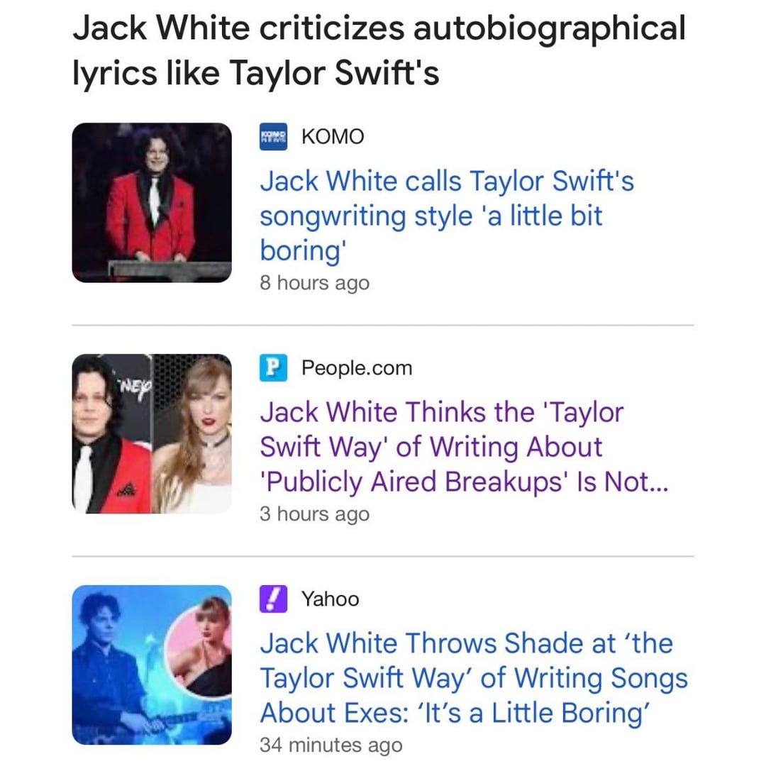 Honestly even if he said Taylor Swift’s writing was boring, why is that wrong/bad? I’ve listened to both of them and objectively there’s a lot more going on with Jack White’s songwriting than Taylor Swift’s. Every single song of hers seems to mention what she was wearing, for instance, when it’s unnecessary and silly. I just think Swifties are afraid to admit their favorite artist is kinda shallow.