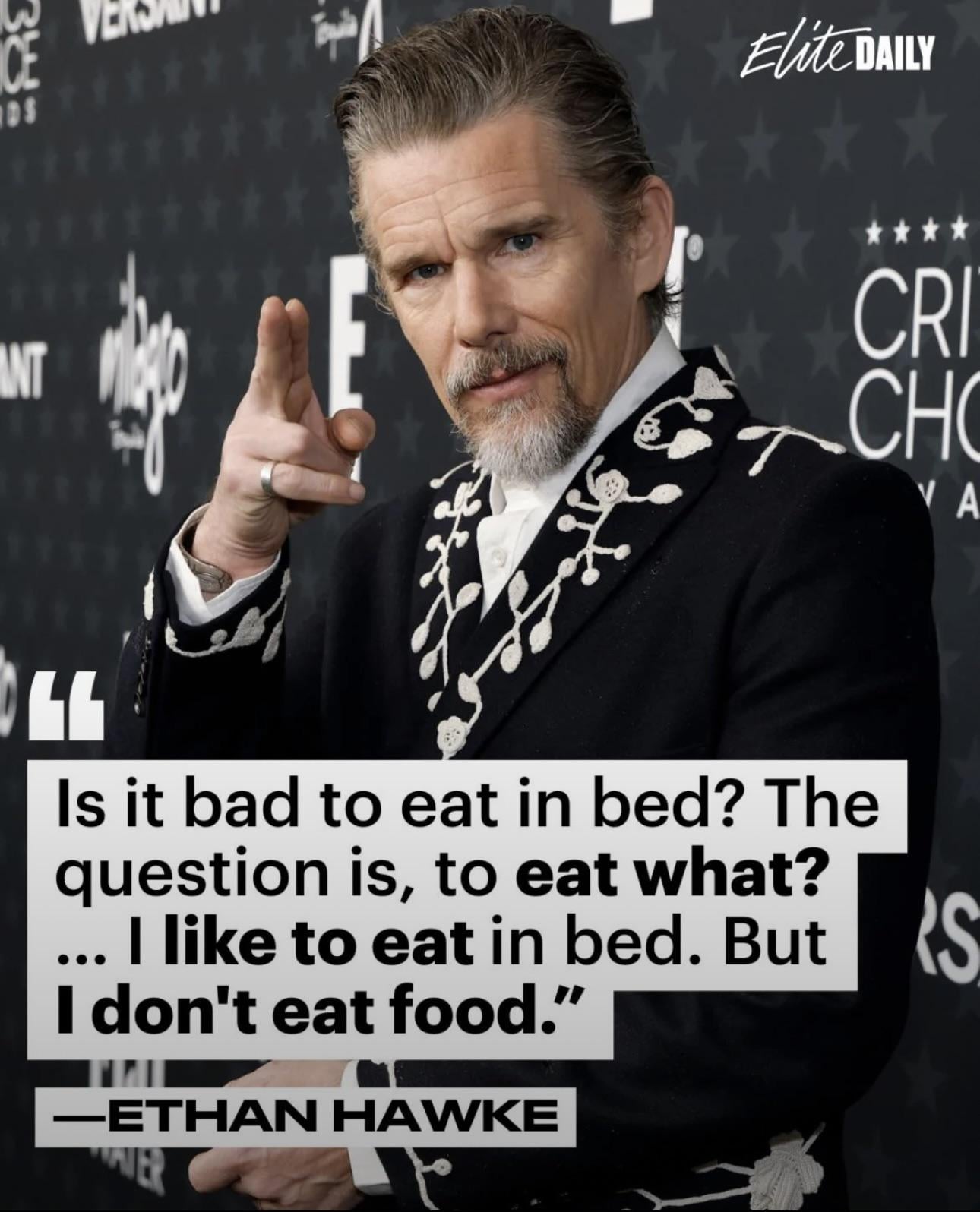"Incredibly vulgar things are going through my brain right now," Hawke said before adding, "I like to eat in bed, but I don’t eat food."