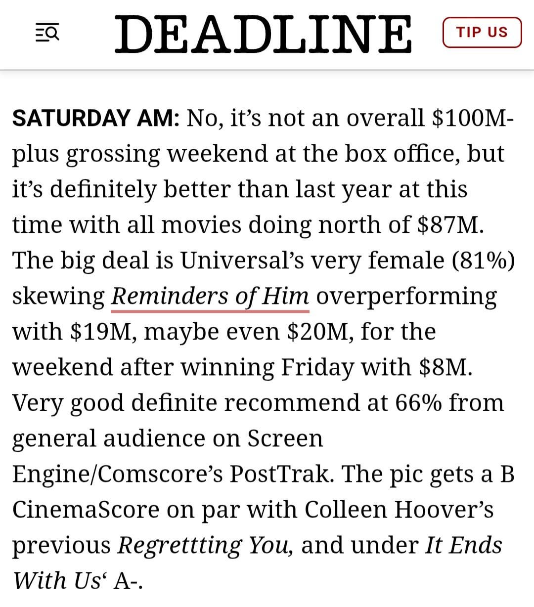 Per Deadline, ‘Reminders Of Him’ earned a 66% definite recommend from general audiences on PostTrak. The audience was 81% female, as well as 51% Caucasian, 29% Latino/Hispanic, 9% Black, and 5% Asian American. 32% came because it was a Colleen Hoover movie, and 30% because it was a romantic drama.