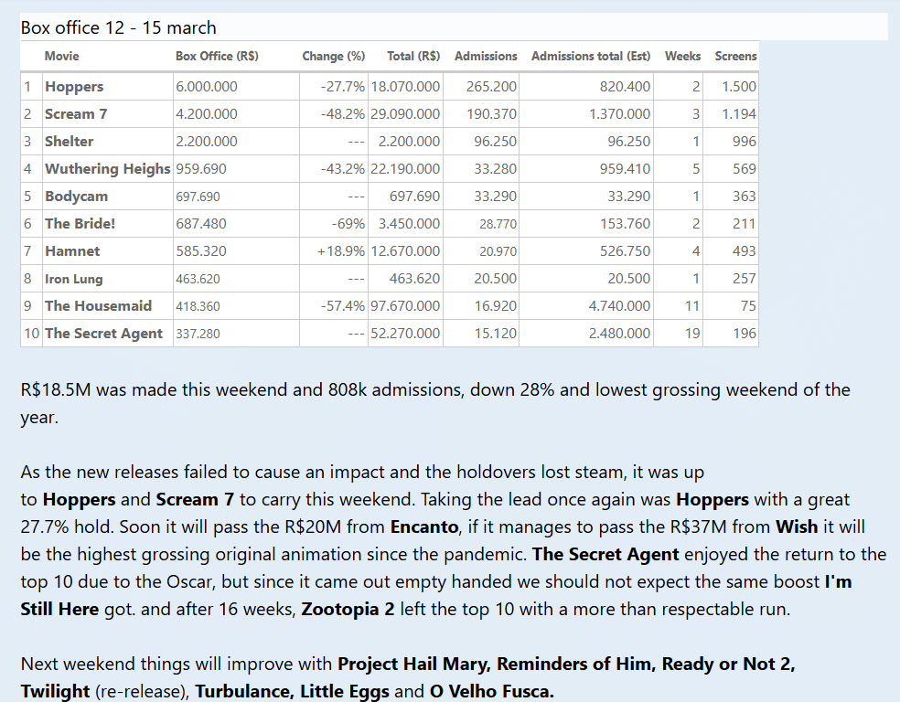 Brazil weekend (12 – 15 march). Weak weekend was carried by the great holds of Hoppers and Scream 7 by ThatWaluigiDude