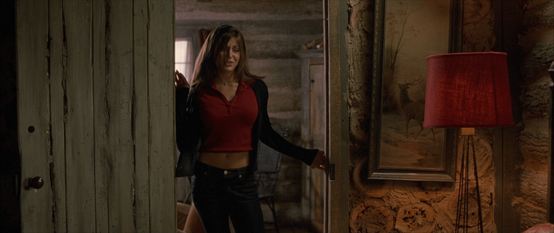 In the opening act, Marcy steps in to the cabin's main bedroom and remarks on how much she likes the cute little room, with its cute little bed, the [lovely] view from the window; and how happy she is that, thanks to the remoteness of the cabin, they can look forward to a nice fun vacation without anybody bothering them. The connotations of that last comment are overtly sexual, as she is already in bed with her boyfriend Jeff when she says it, and they are excitedly getting undressed to have sex.
