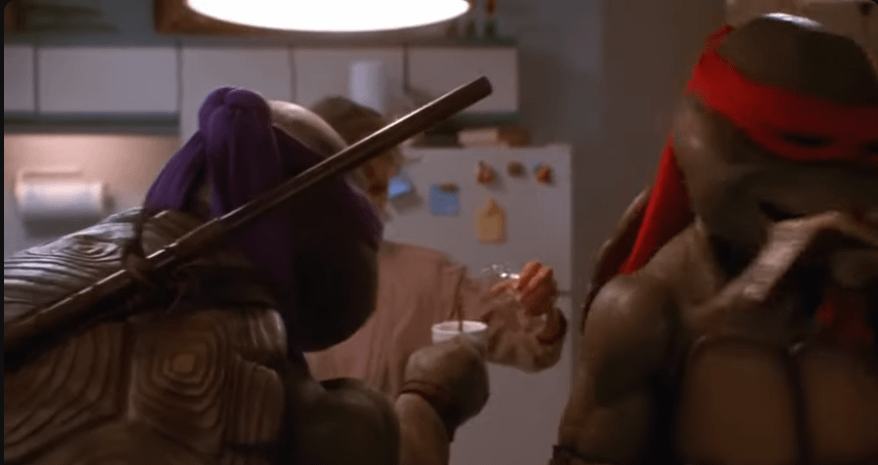 In Teenage Mutant Ninja Turtles II: The Secret of The Ooze (1991), April can be seen pouring an unidentified clear liquid into Donatello’s coffee mug. Some of it misses the cup