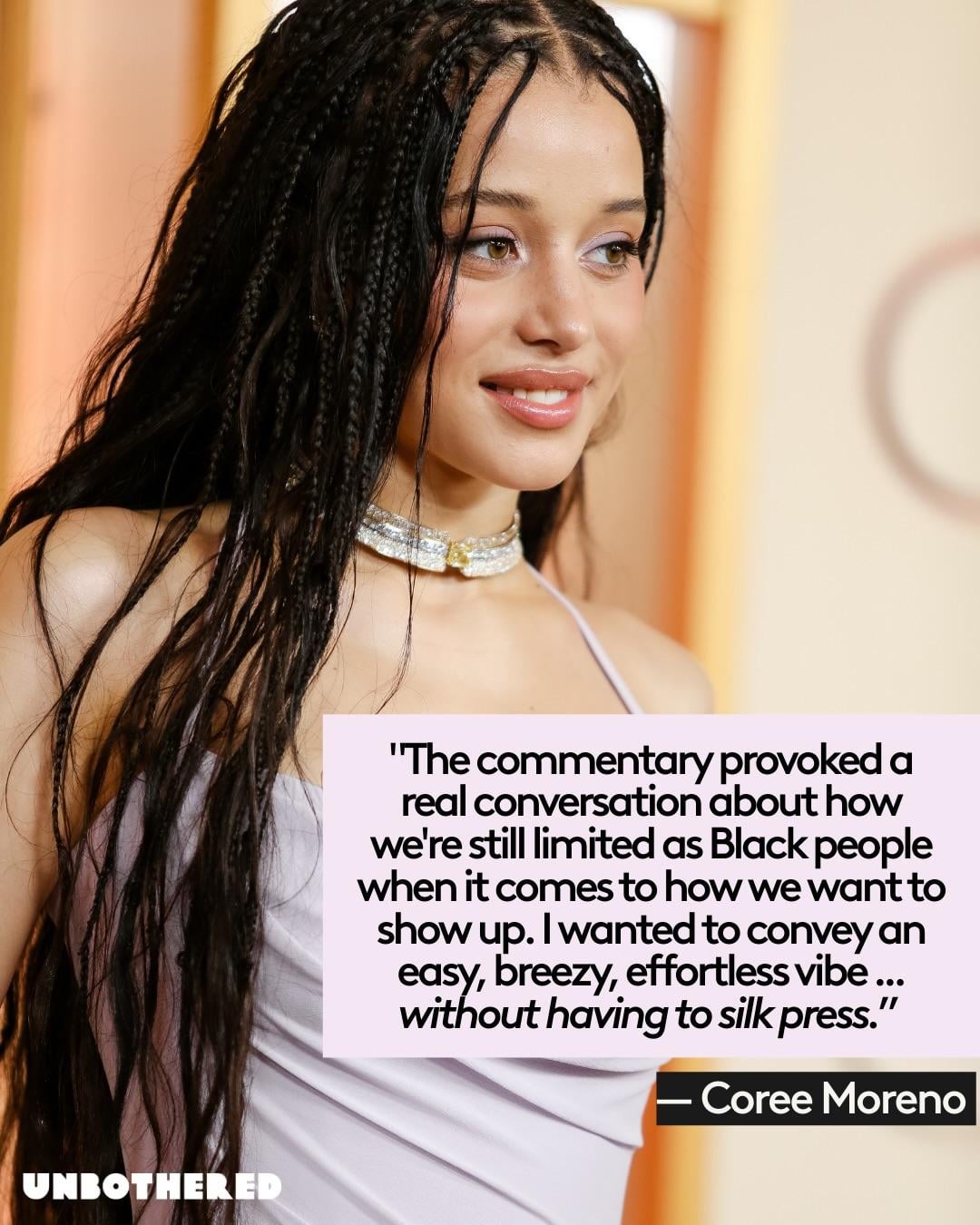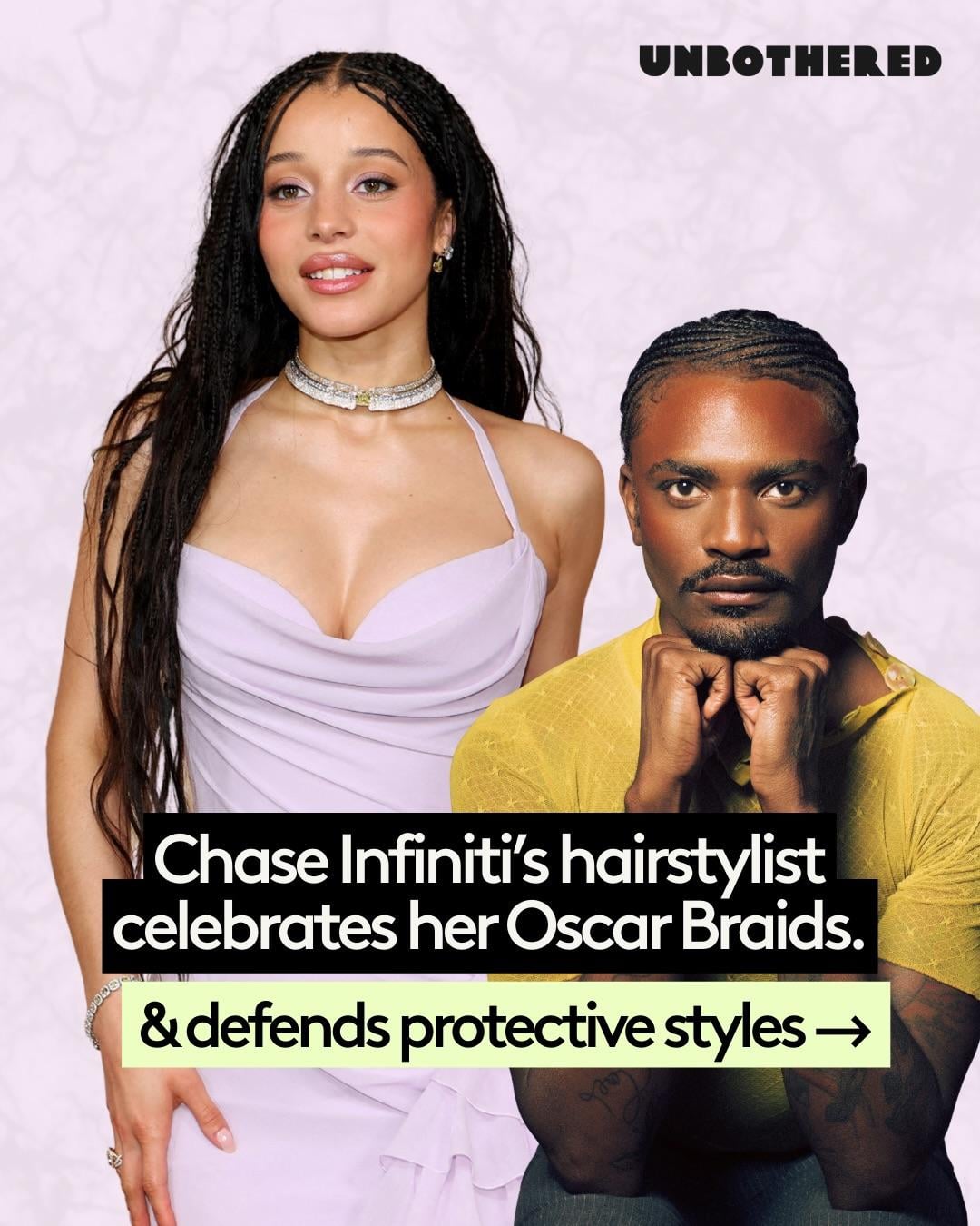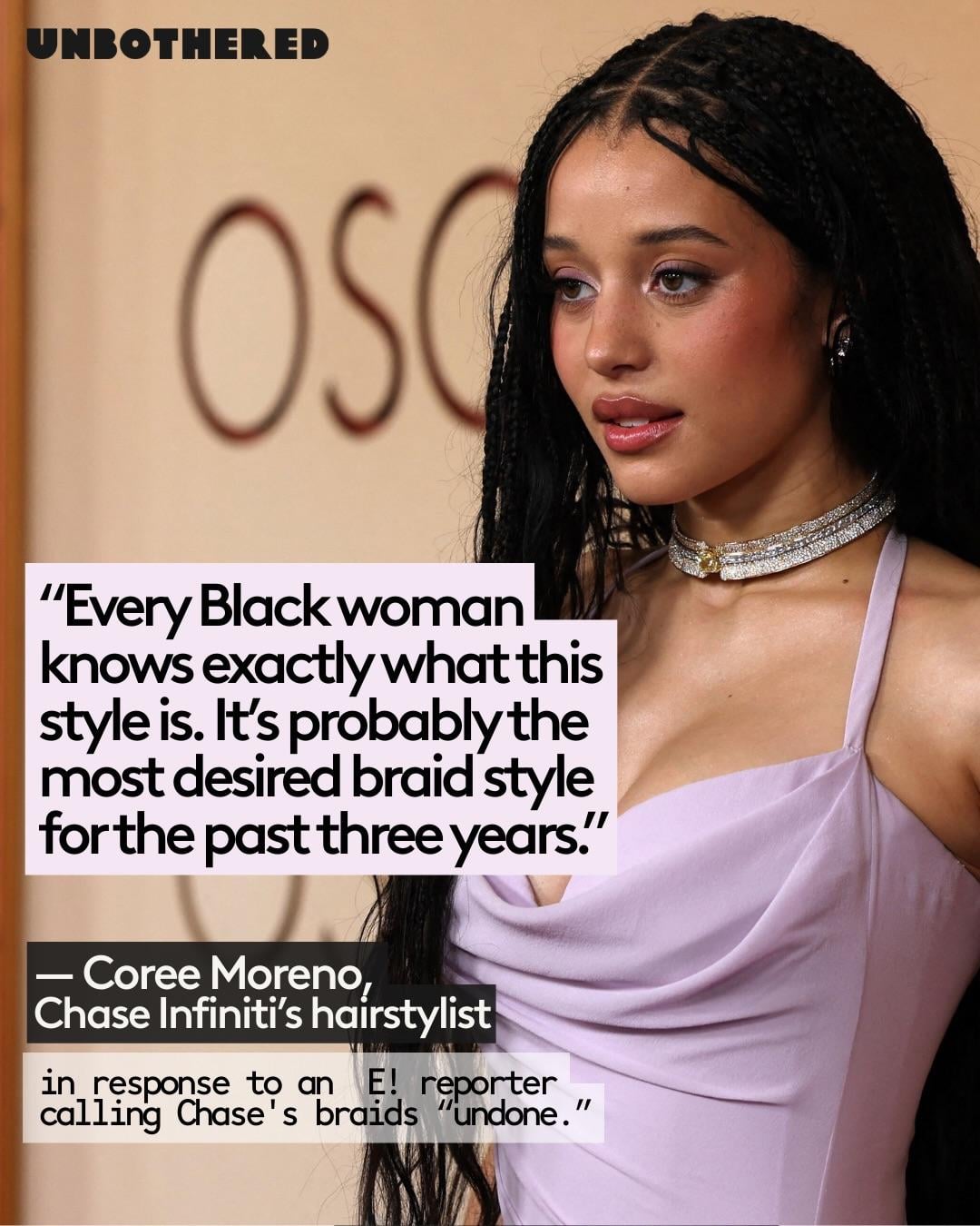 Coree Moreno, Chase Infiniti’s hairstylist, shares a response to an E! News reporter calling her Oscars boho knotless braids ‘undone’: “The commentary provoked a real conversation about how we’re still limited as Black people when it comes to how we want to show up.”