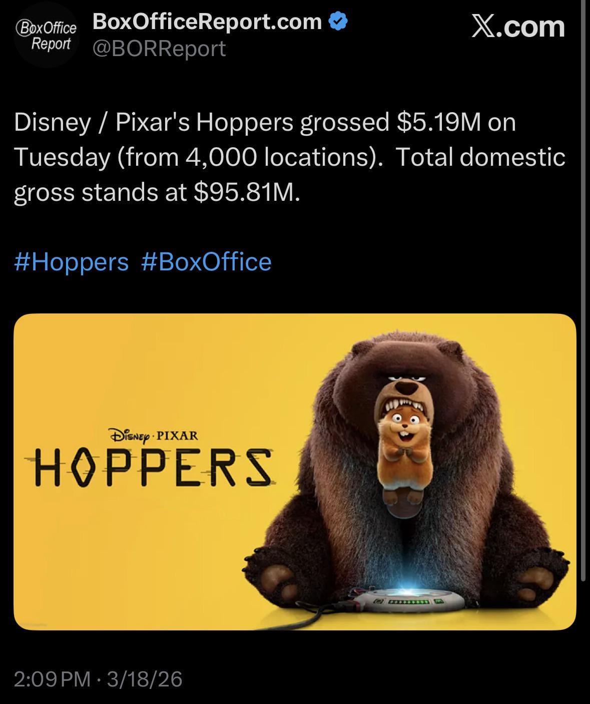 Disney / Pixar’s Hoppers grossed $5.19M on Tuesday (from 4,000 locations). Total domestic gross stands at $95.81M.March 18, 2026