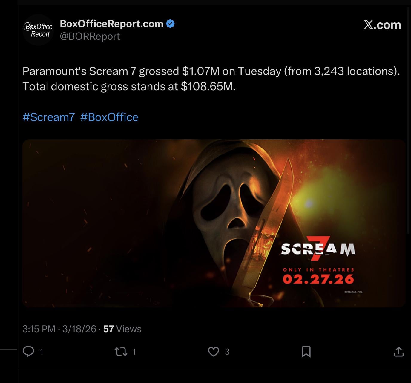 Paramount’s Scream 7 grossed $1.07M on Tuesday (from 3,243 locations). Total domestic gross stands at $108.65M. It has now surpassed Scream VI as the highest grossing movie in the franchise Domestically