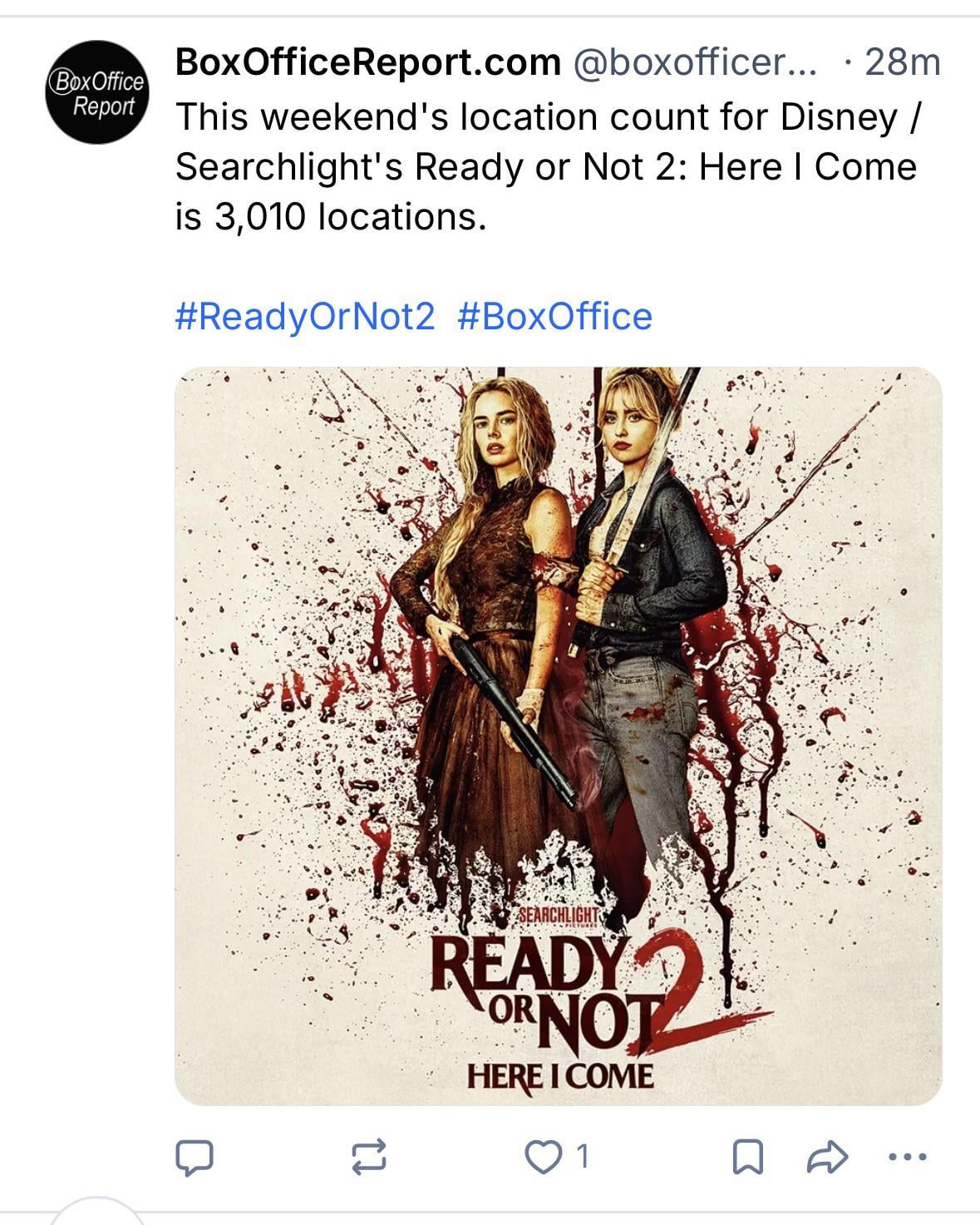 This weekend’s location count for Disney / Searchlight’s Ready or Not 2: Here I Come is 3,010 locationsMarch 19, 2026