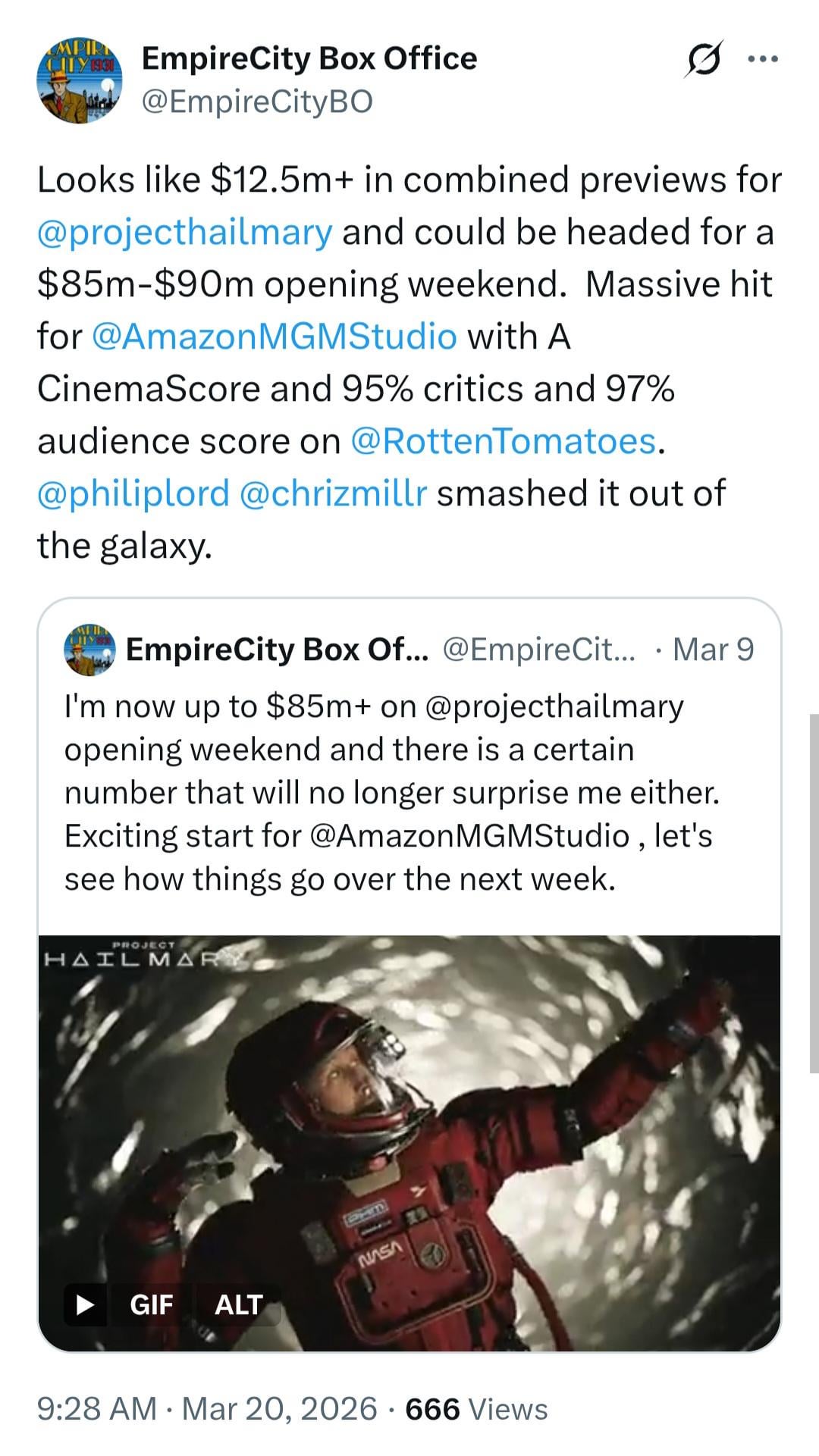 EmpireCity – Looks like $12.5m+ in combined previews for Project Hail Mary and could be headed for a $85m-$90m opening weekend.