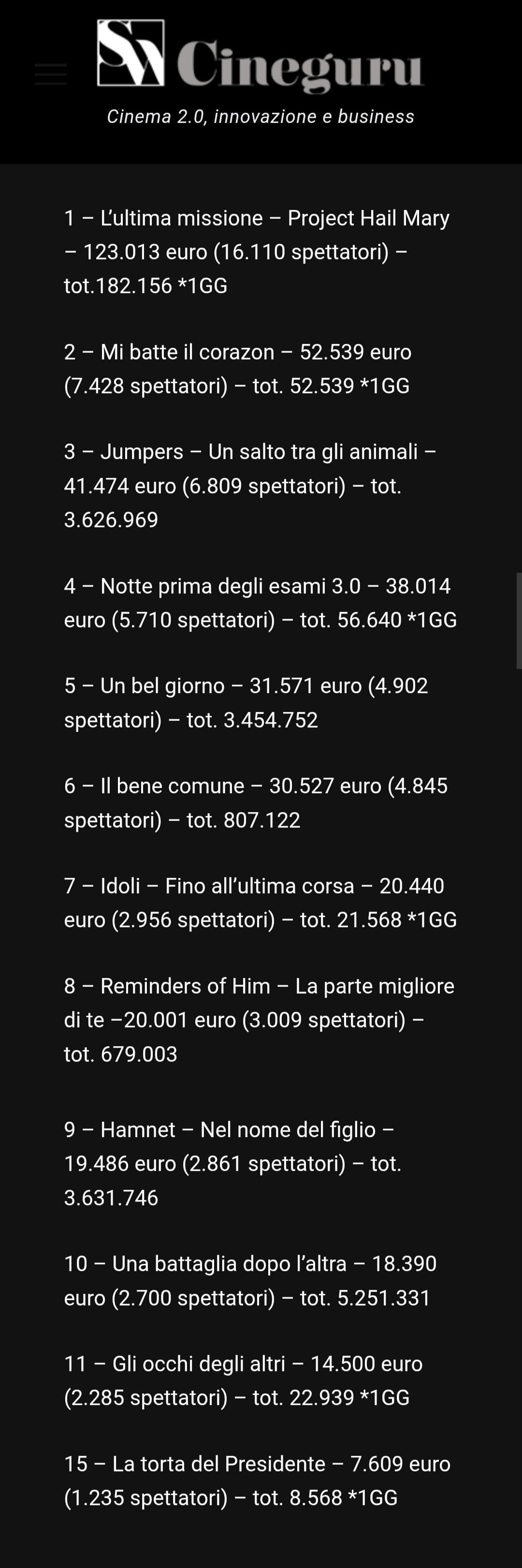 Source: https://cineguru.screenweek.it/2026/03/lultima-missione-esordisce-al-primo-posto-il-box-office-di-giovedi-19-marzo-49340/ by AGOTFAN