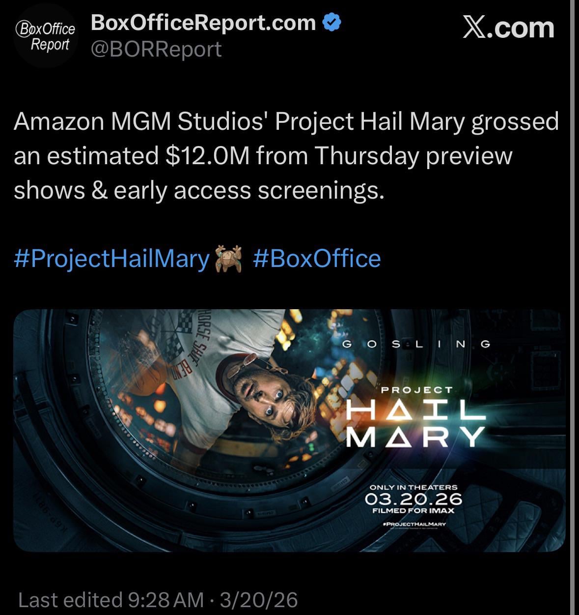 Comparable films for Thursday night previews would be Avatar 3 with $12.5m, Lilo and Stitch with $14.5m, and Zootopia 2 & Minecraft with $10m- $10.5m domestic previews.