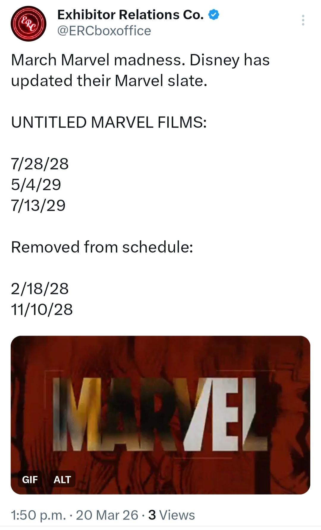 Disney has updated their Marvel slate, with UNTITLED MARVEL FILMS opening on 7/28/28, 5/4/29, and 7/13/29. Films previously set for 2/18/28 and 11/10/28 have been removed from the schedule.