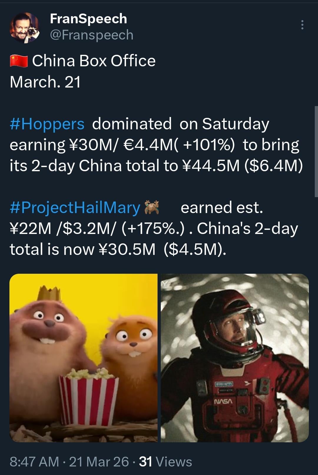 China Box Office March. 21: Hoppers dominated on Saturday earning ¥30M/ €4.4M( +101%) to bring its 2-day China total to ¥44.5M ($6.4M). ProjectHailMary earned est. ¥22M /$3.2M/ (+175%.) . China’s 2-day total is now ¥30.5M ($4.5M).