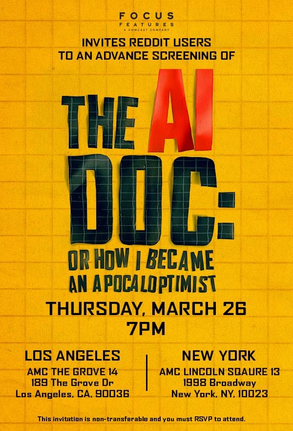 Focus Features is offering Reddit users free tickets to a special advanced screening of The AI Doc: Or How I Became an Apocaloptimist, ahead of its regular release. The screenings will take place at 2 different theaters in NYC (AMC Lincoln Square) and LA (AMC The Grove) on Thursday 3/26 at 7 PM. You can bring a guest as well.