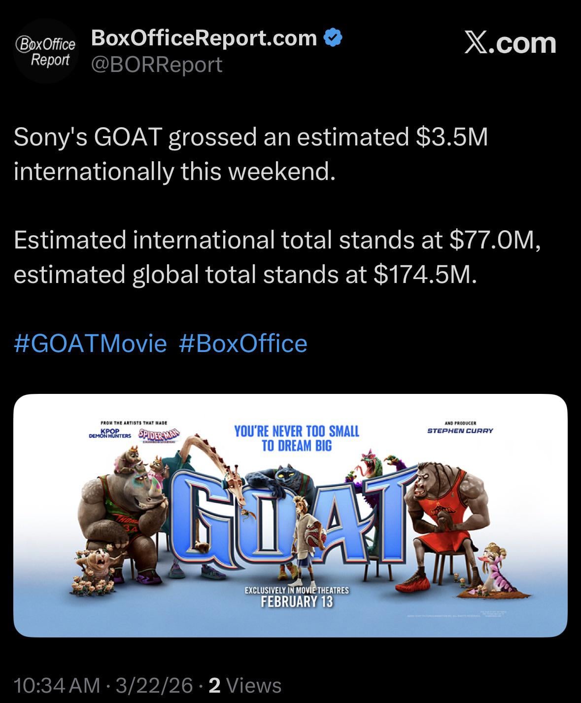 With The Super Mario Galaxy Movie set to open big within 1.5 weeks from now, it looks like Goat will finish around $185M-$200M WW (around TMNT Mutant Mayhem and If range) that is so close of breaking even especially with South Korea and Japan has no confirmed release dates for Goat