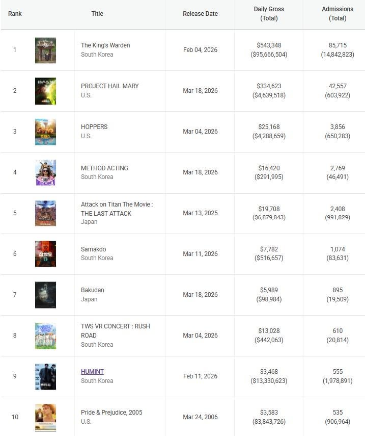 Project Hail Mary: The movie has crossed 600k admits, as presales are looking very hot currently. Likely will have a significant cultural day boost as the movie is still eyeing a finish around 1.5 million to 1.8 million admits.