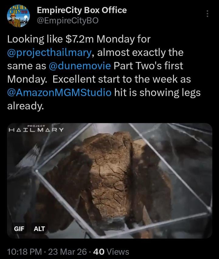 Looking like $7.2m Monday for @projecthailmary, almost exactly the same as @dunemovie Part Two’s first Monday. Excellent start to the week as @AmazonMGMStudio hit is showing legs already.