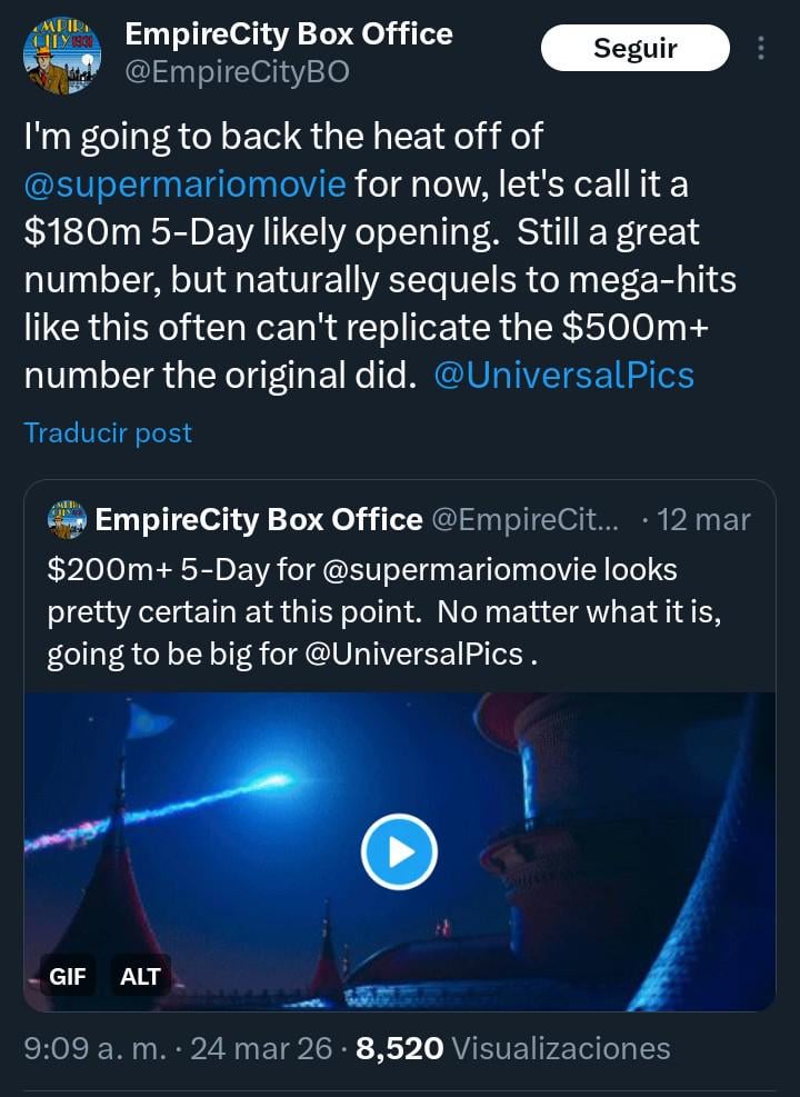 I’m going to back the heat off of @supermariomovie for now, let’s call it a $180m 5-Day likely opening. Still a great number, but naturally sequels to mega-hits like this often can’t replicate the $500m+ number the original did. @UniversalPics