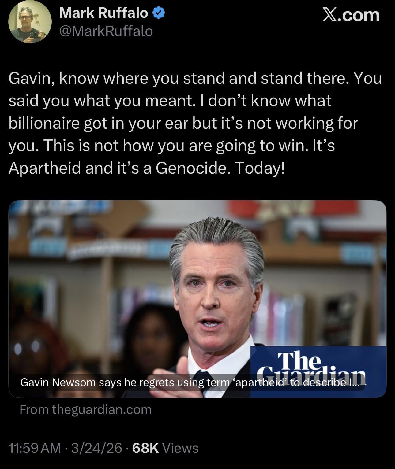 The way I was shocked when it was reported Newsom said that previously cuz I could’ve sworn he was bought like the rest of the establishment dems. Him back tracking is way more typical of his two face behavior. Glad ruffalo is standing ten toes down. These dems wanna please all aisles when some aisles just aren’t meant to be crossed for them. Why compromise yourself to get a few maga voters when you can strengthen your message and get more independents on your side. SMH. They lose the plot every time