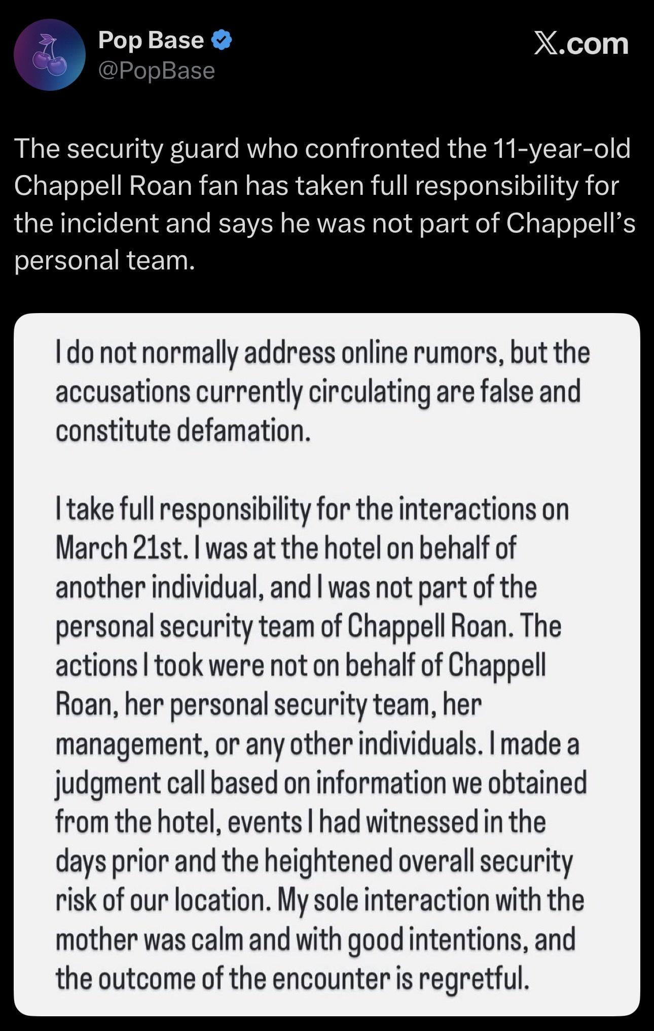 The security guard who confronted the 11-year-old Chappell Roan fan has taken full responsibility for the incident and says he was not part of Chappell’s personal team.