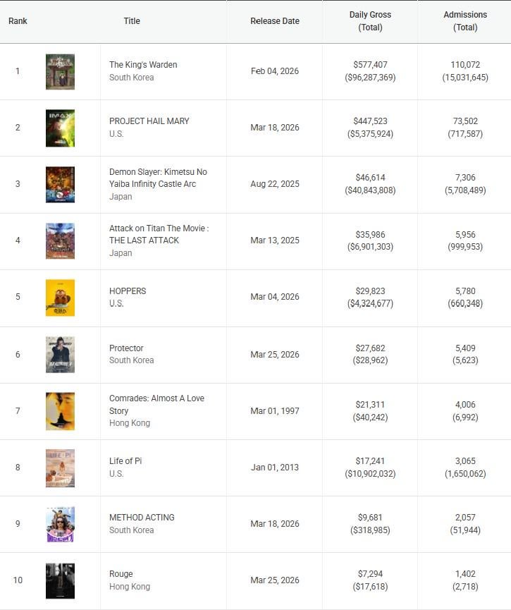 The Man Who Lives With the King: The movie has crossed 15 million admits as the movie is still on track to slide across 15.6 million admits on Sunday.