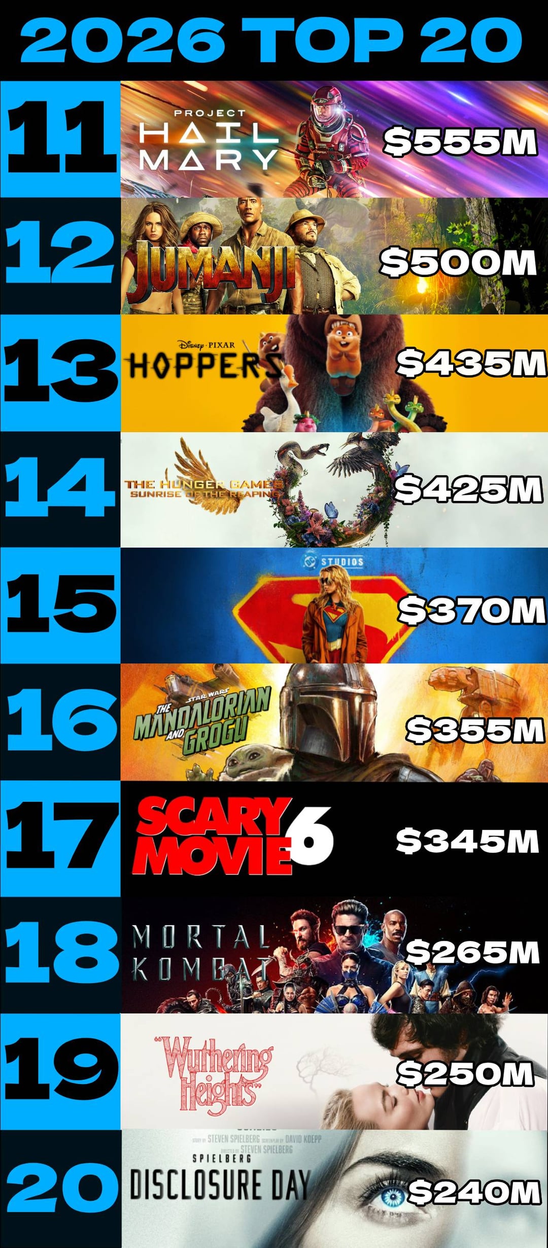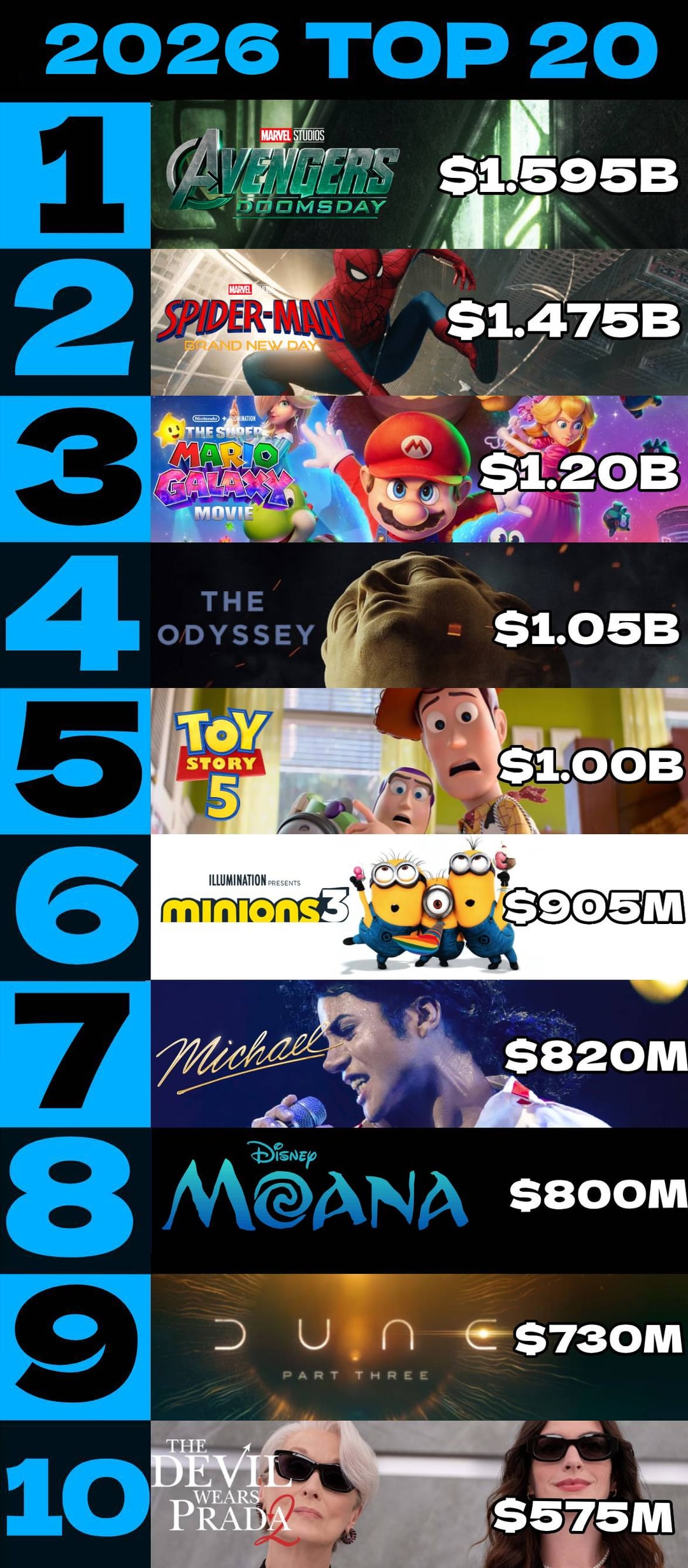 Moana at $800M is wishful thinking with how recent Disney remakes have performed. It will crack a billion for sure. Odyssey and Toy Story 5 probably do slightly worse. And I think Project Hail Mary will be in the Top 10.