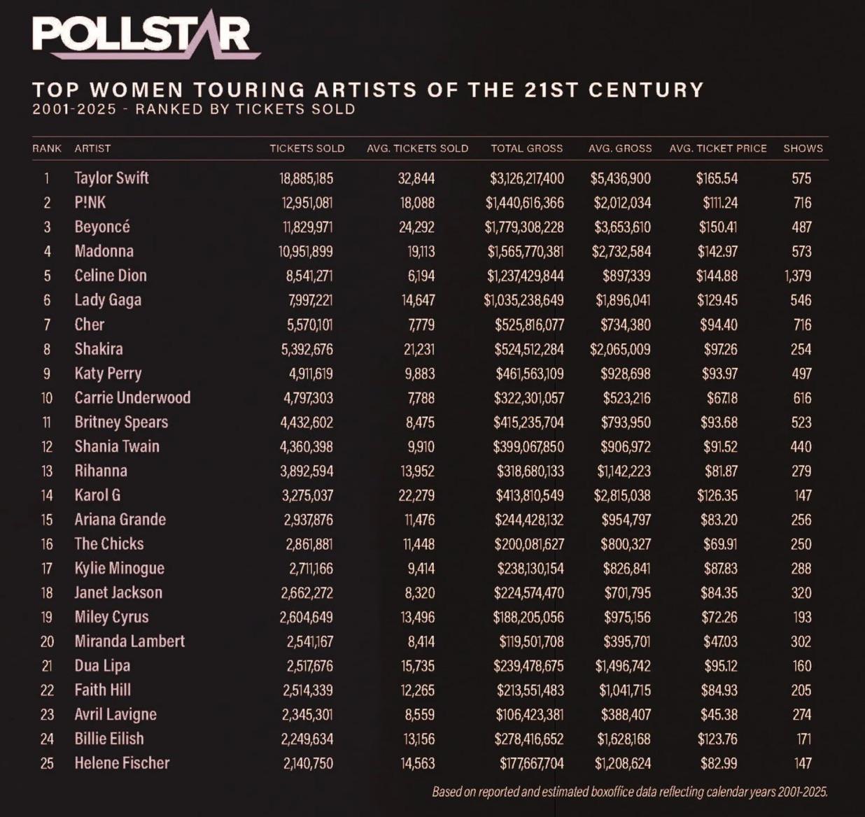 For anyone interested, [here](https://news.pollstar.com/2025/12/08/coldplay-u2-sheeran-dmb-top-pollstars-25-most-popular-touring-artists-of-the-millennium/) are the top 10 overall biggest touring artists of the 21st century by ticket admissions.