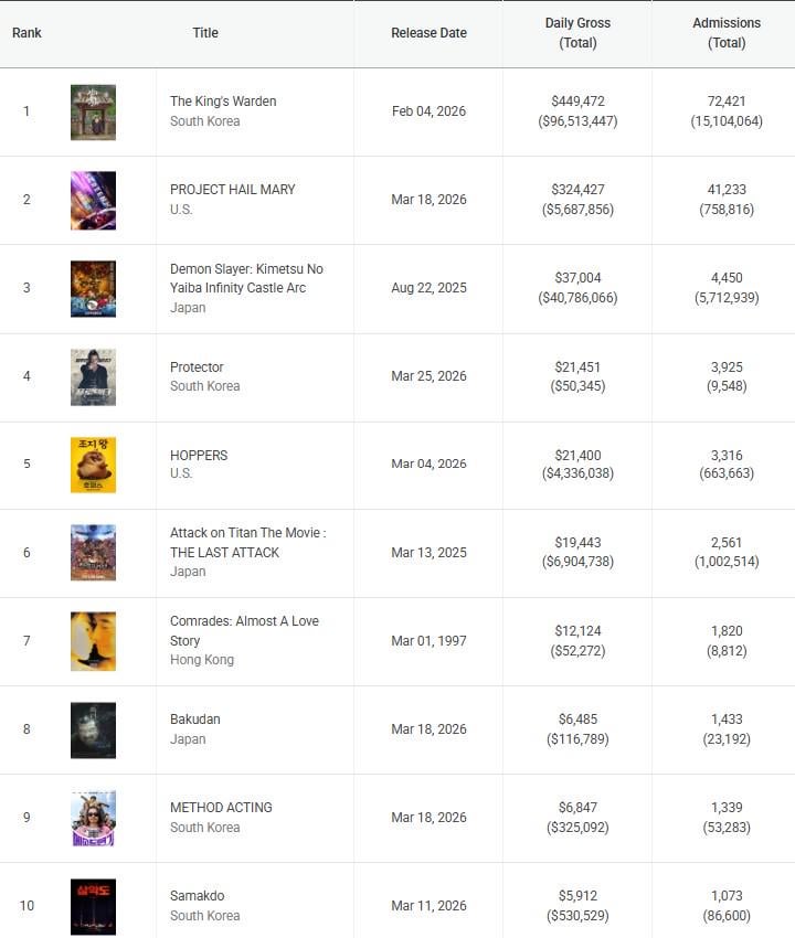 The Man Who Lives With the King: The movie has crossed 15.1 million admits as the movie should cross 15.2 million admits tomorrow, as the movie is approaching that 15.6 million admits mark this weekend.
