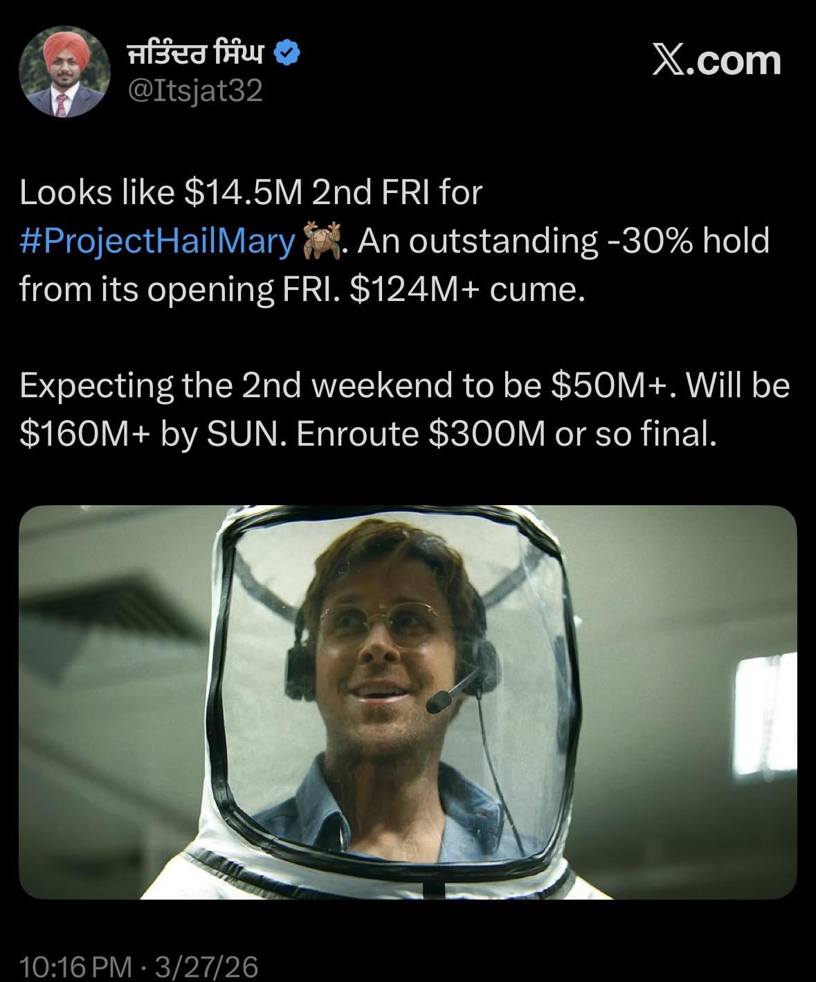 Looks like $14.5M 2nd FRI for #ProjectHailMary . An outstanding -30% hold from its opening FRI. $124M+ cume. Expecting the 2nd weekend to be $50M+. Will be $160M+ by SUN. Enroute $300M or so final.
