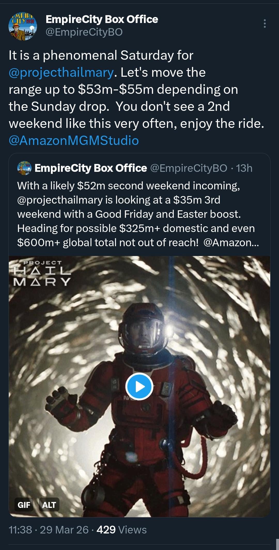 EmpireCity: It is a phenomenal Saturday for @projecthailmary. Let’s move the range up to $53m-$55m depending on the Sunday drop. You don’t see a 2nd weekend like this very often, enjoy the ride.