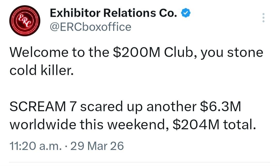 SCREAM 7 scared up another $6.3M worldwide this weekend, $204M total.