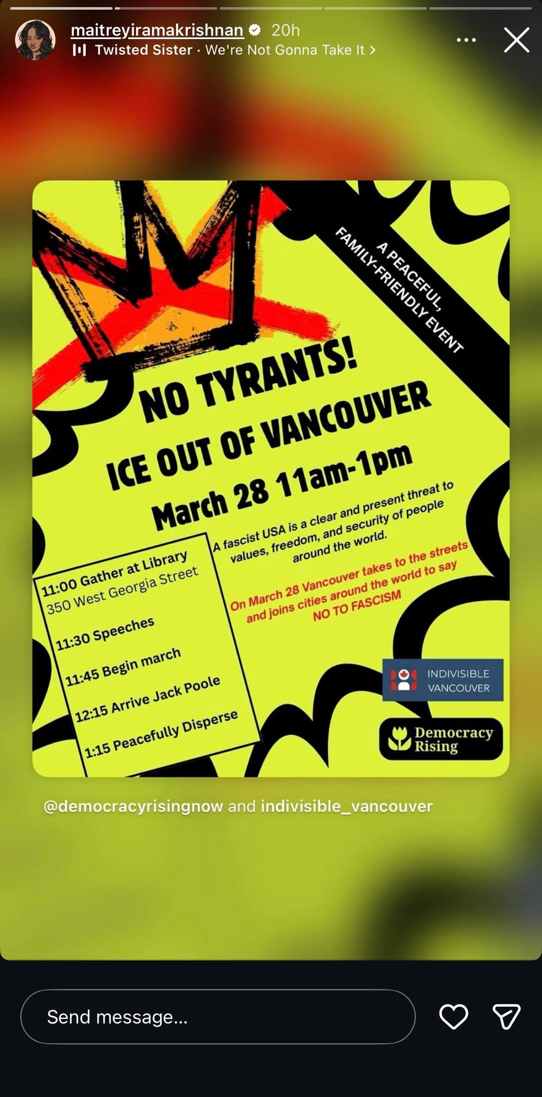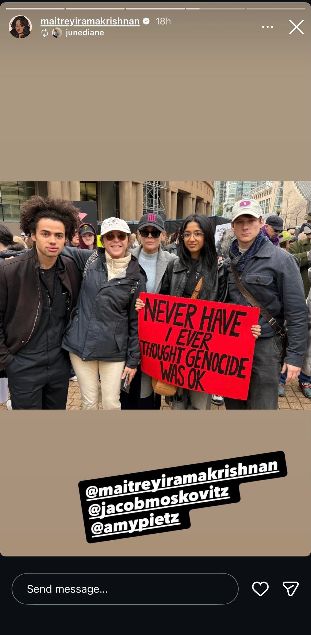 Maitreyi Ramakrishnan attends the “No Tyrants” protest in Canada:”Never Have I Ever Thought Genocide Was Okay.”March 29, 2026