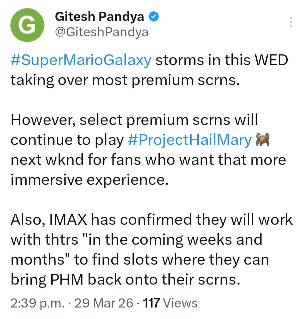 IMAX has confirmed they will work with theaters “in the coming weeks and months” to find slots where they can bring Project Hail Mary back onto their screens. The Super Mario Galaxy Movie will take over IMAX and most premium screens starting Wednesday.
