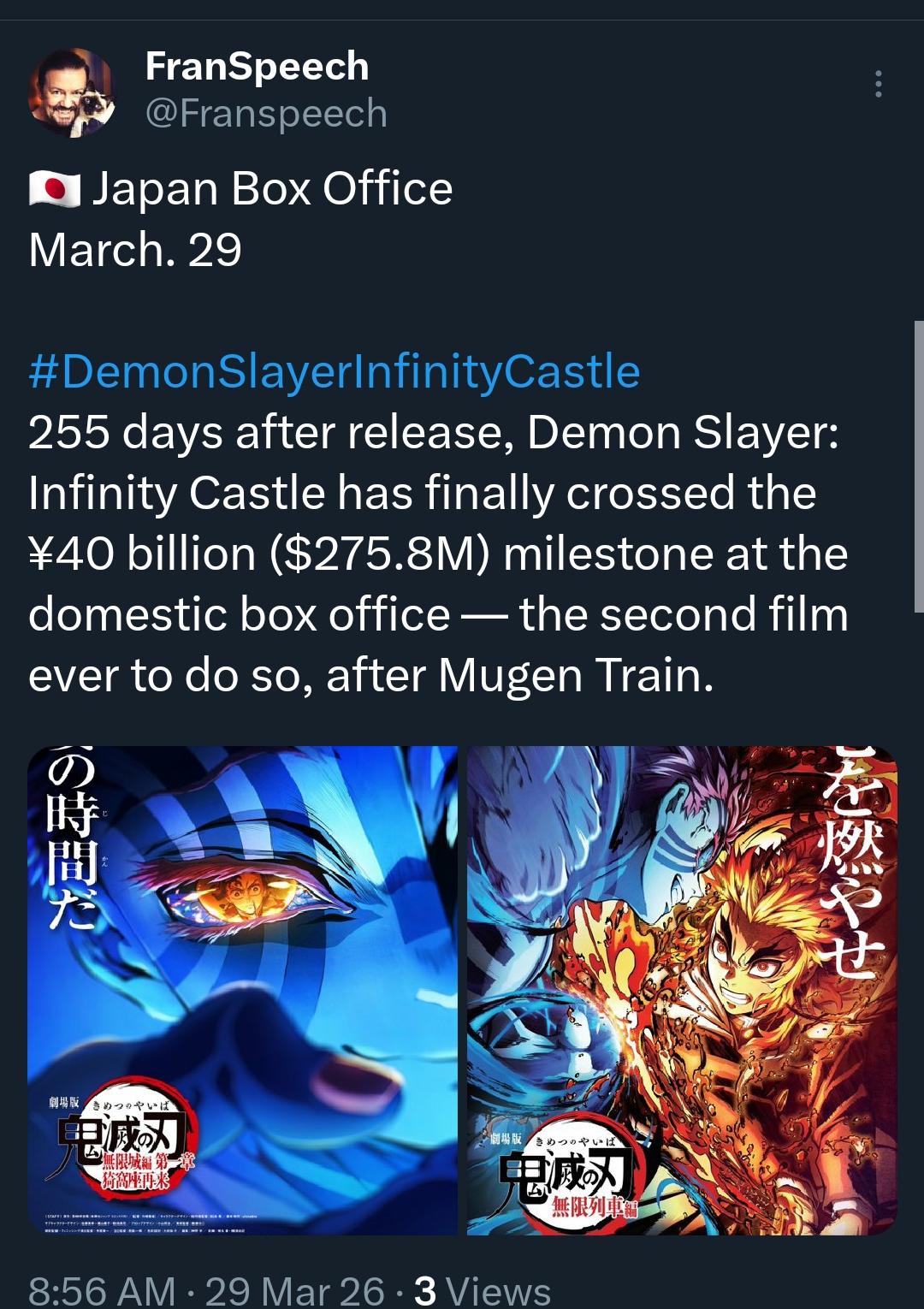 Japan Box Office March. 29 / 255 days after release, Demon Slayer: Infinity Castle has finally crossed the ¥40 billion ($275.8M) milestone at the domestic box office — the second film ever to do so, after Mugen Train.
