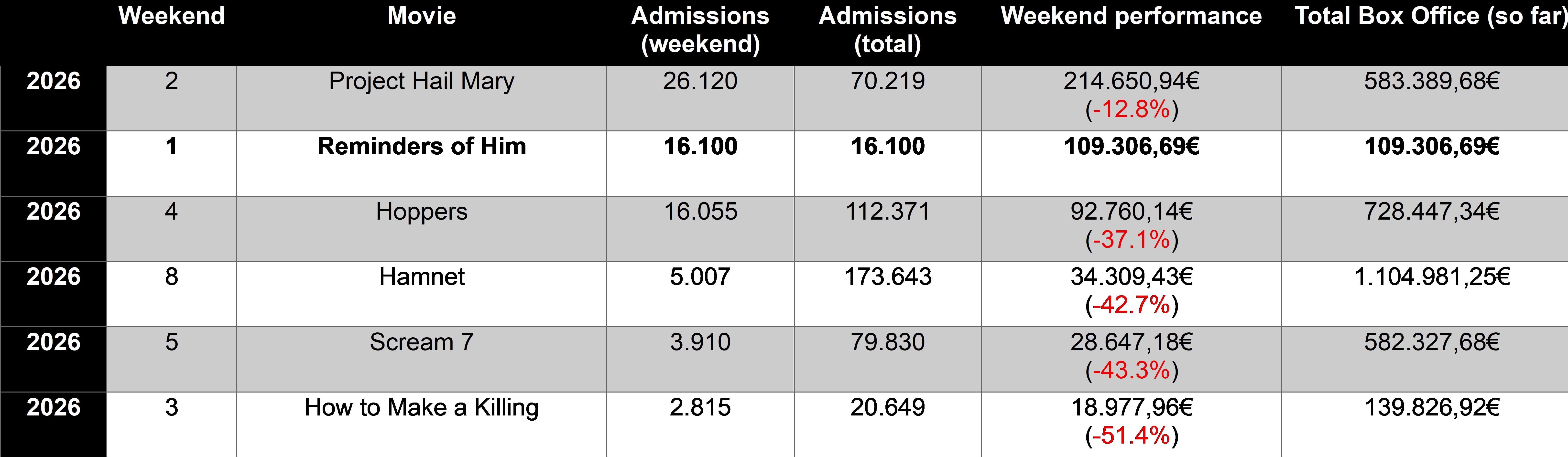 [Portugal] Very small drop for ‘Project Hail Mary’, but very weak weekend overall (Mar. 26-29)March 30, 2026