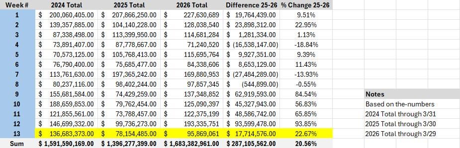 I think we should be able to increase the distance between us and 2025 through April. Even with the slow presale start for Michael (Which hopefully improves), we still have Mario and PHM, which combined should be able to gross a significant portion of 2025’s April and a bunch of smaller films like Drama, You, Me & Tuscany, and The Mummy will help us. However Michael’s slow start hints at it being closer than I originally thought,