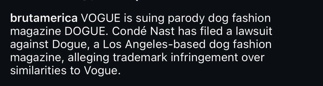 Would this even hold up in court? There are so many parodies out there like this… and it’s just a parody magazine featuring dogs. Get over it, Vogue.