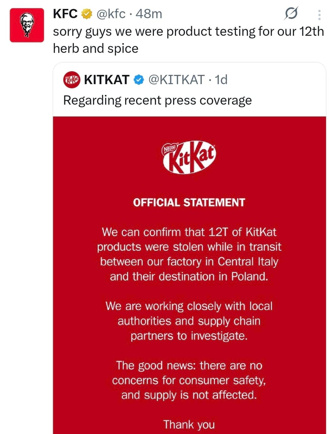 I noticed this on twitter. Never seen brands clown another company for products being stolen lmao. They should make a KitKat pizza nonetheless 😆