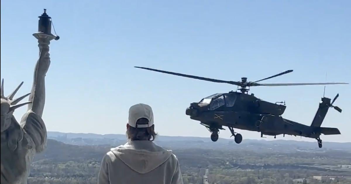 T_Shurt on March 31, 2026 6:07 pm From the article: The U.S. Army has suspended the crew of AH-64 Apache helicopters that did a cringeworthy fly past of MAGA star Kid Rock’s Nashville home. The helicopters flew 50 miles from Fort Campbell, Kentucky to Nashville, then hovered just beyond the edge of Kid Rock’s swimming pool. U.S. officials told NBC News that a probe has been launched and the bonkers stunt earned the crew a suspension.