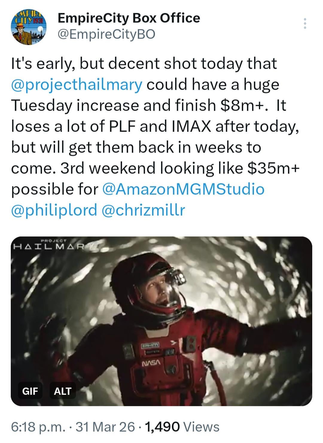 It’s early, but decent shot today that Project Hail Mary could have a huge Tuesday increase and finish $8m+. It loses a lot of PLF and IMAX after today, but will get them back in weeks to come. 3rd weekend looking like $35m+ possible.
