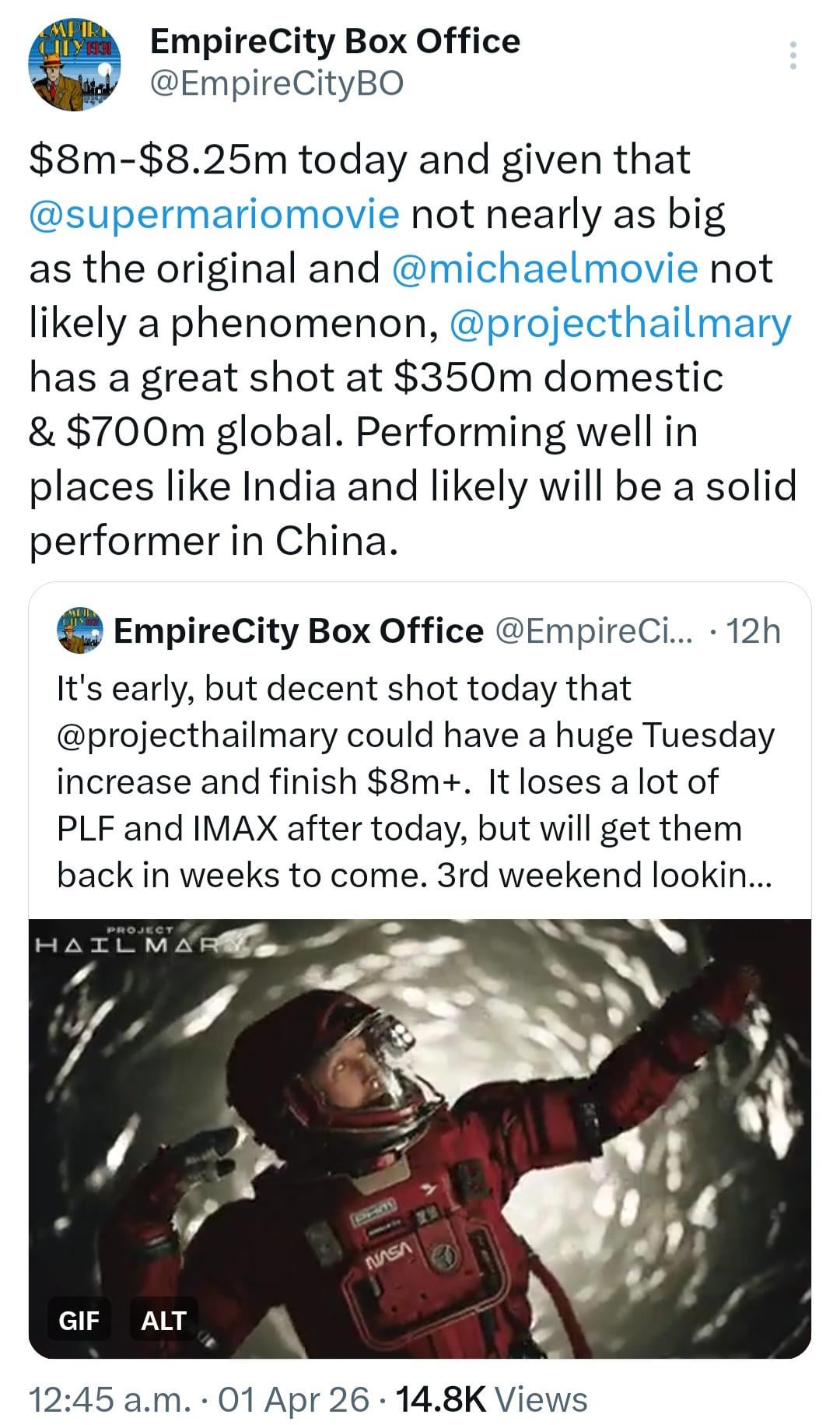 $8m-$8.25m on Tuesday, and given that The Super Mario Galaxy Movie not nearly as big as the original and Michael not likely a phenomenon, Project Hail Mary has a great shot at $350m domestic & $700m global. Performing well in places like India and likely will be a solid performer in China.