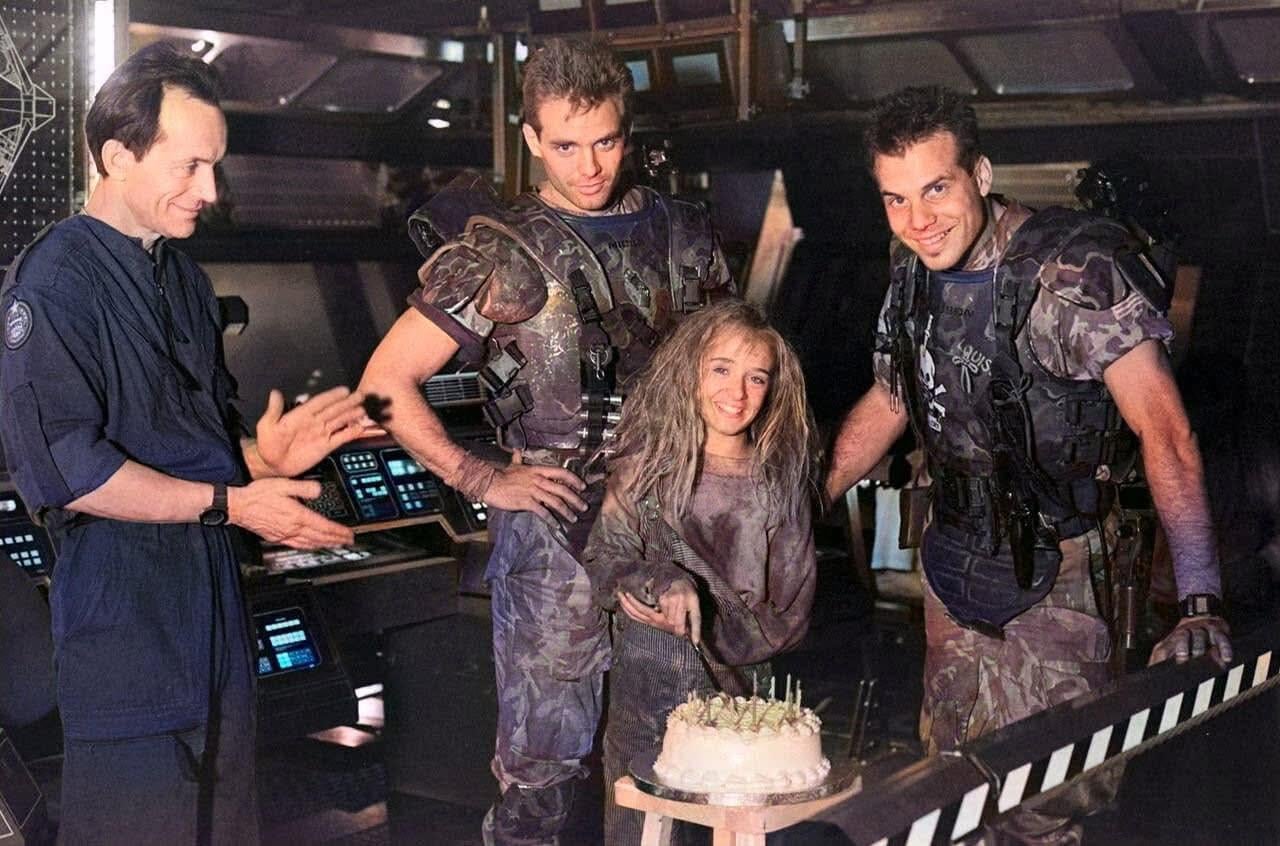 Bishop, Hicks, and Hudson celebrating Newt stunt double Louise Head’s birthday on the set of Aliens, Pinewood Studios, England 1986